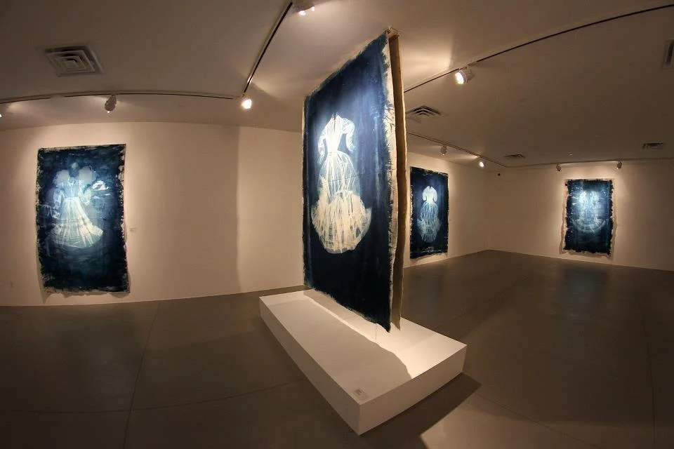 Exhibition in Los Angeles California Museum of Art and Science MOAH - My 8 foot by 10 foot Cyanotypes of vintage edwardian gowns printed on canvas. 1800's antiquarian process of light sensitive chemistry painted onto canvas in darkness and then processed in sunlight until image appears. Then processed.